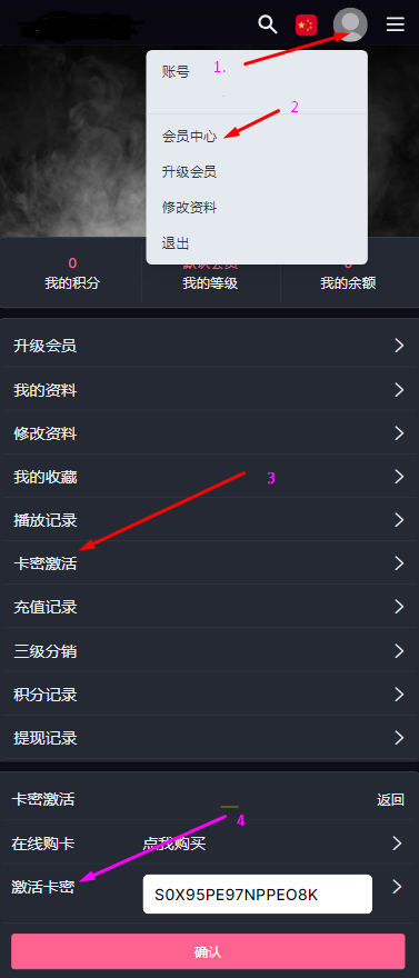 4。复制卡密后进入本站会员中心找到卡密激活页面粘贴复制的卡密即可激活